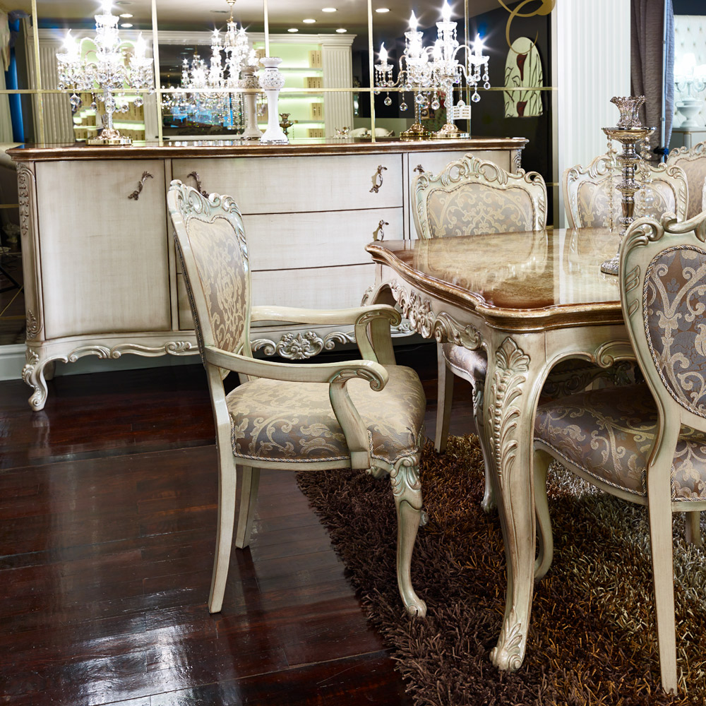 Konsol , Masa , Vitrin ve 8 adet Antico sandalyeden oluşan yemek odasında bütünüyle el işçiliğinin bir timsali olarak üretilmiştir. İnce , Zarif ve bir dantela gibi tamamen el işçiliği ile yapılan oymaları , gene hiç bir detay atlanmadan yapılan cilası tamamen el işçiliği ile bu eşsiz dokusuna kavuşmuştur. Masa ve Konsol üstünde değişik bir gümüş varak sistemi kullanılan Antico Yemek odası az sayıda üretilmiş olup gelecekte Antika seviyesinde kullanılacağına inanmaktayız.